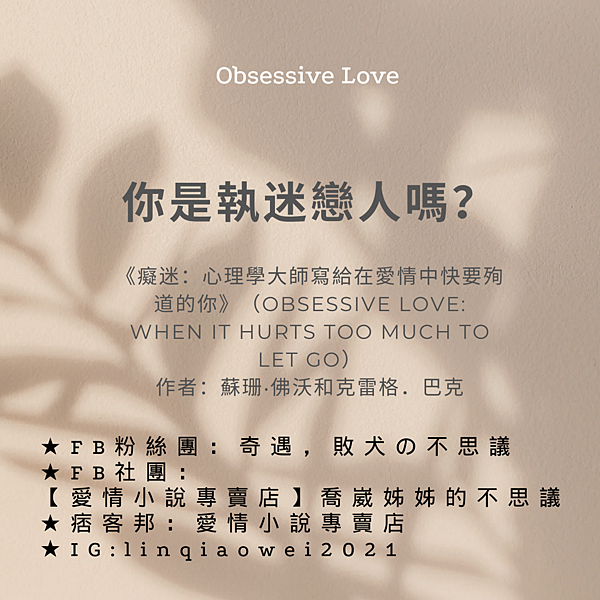 上面是比較粗淺的建議,書中後面有提到一些方法可以展開執迷戀人的療癒之旅,喬崴姊姊覺得大家可以試試看,要治癒自己心中的那塊匱乏,需要給自己一些時間,但越早行動,越快擺脫夢魘。