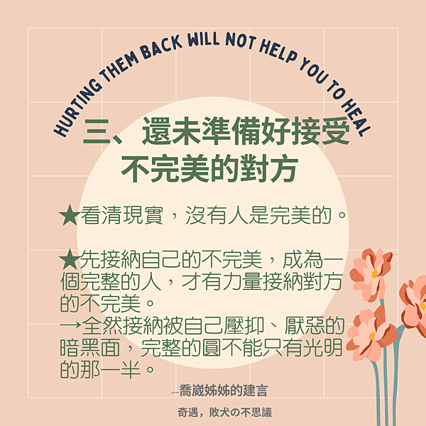那時的自己內心深處還有一個非理性信念,「自己找得到真愛、好對象嗎?」所以,說穿了,是還沒能接納不完美的自己,很多看不慣相親對象特質的,其實是自己壓抑的黑暗面,導致無法成為完整的個體和正確的信念,而讓自己有能量去接納不完美的別人,下意識是抗拒進入婚姻的。
