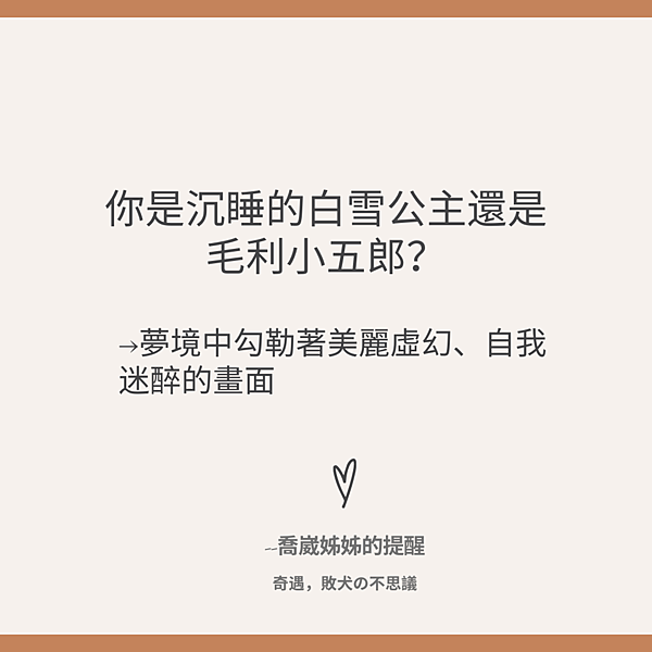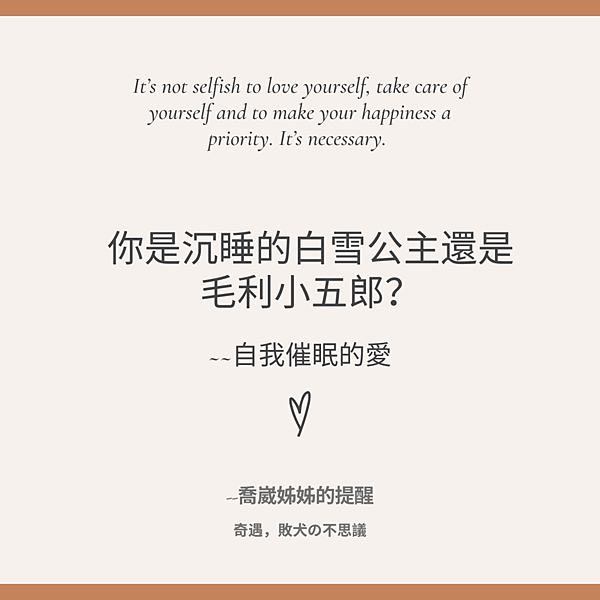 【愛情小說專賣店】今天要提醒大家「你是沉睡的白雪公主還是毛利小五郎?」心靈療癒系《奇遇,敗犬の不思議》裡,談到自我催眠的愛,你是不是也曾經犯了這樣的傻?渾然不自覺,自己的愛情觀認知錯誤,你知道正確的愛該是什麼樣子嗎?你活在自己構築的虛擬的愛,非常危險,喬崴姊姊真的心疼這樣的你,希望你可以覺醒。