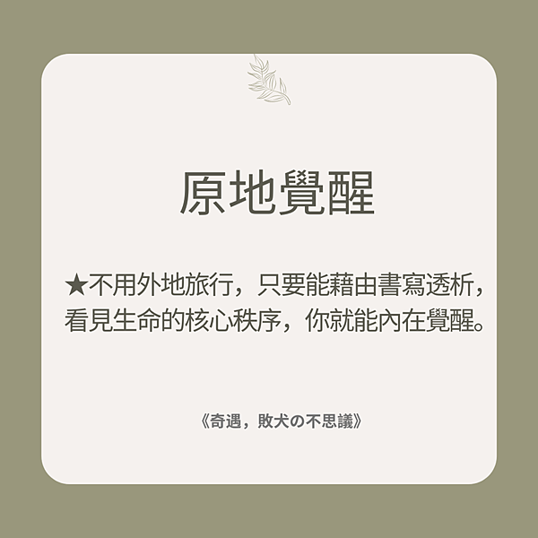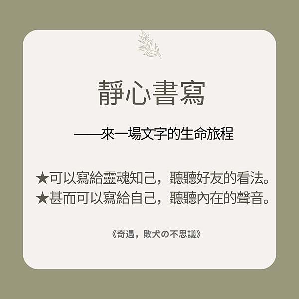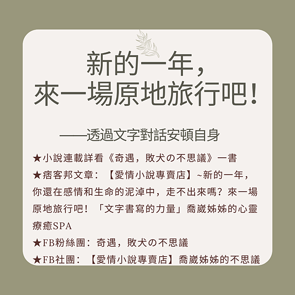 新的一年已到,你還在感情和生命的泥淖中,走不出來嗎?【愛情小說專賣店】喬崴姊姊真心希望所有處於內心狂亂、迷惑、不安、沮喪和絕望等負能量的人兒,能將自身難解的生命故事透過書寫記錄下來,從一開始的宣洩情感,不斷的有意識的梳理,到剖析和覺知,用文字的力量讓自己看清生命的秩序。如果有知心好友,就像《奇遇,敗犬の不思議》療癒小說裡,喬崴和若琳相濡以沫,透過寫信尋求知己的撫慰和給予建議,也互相療傷和治癒。如果沒有適合傾訴的對象,也無妨,我們仍可學著自我療癒,書寫下來就是一個好的療癒心法。