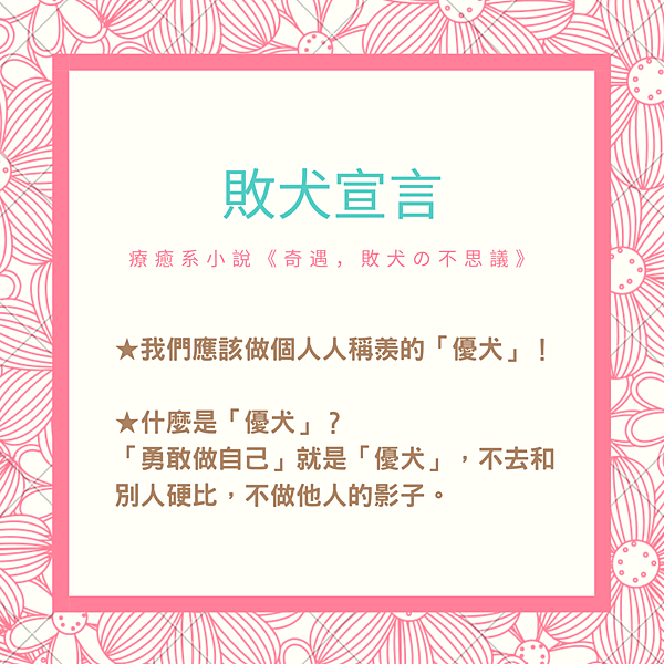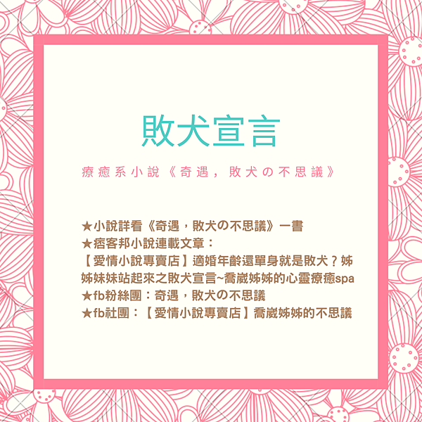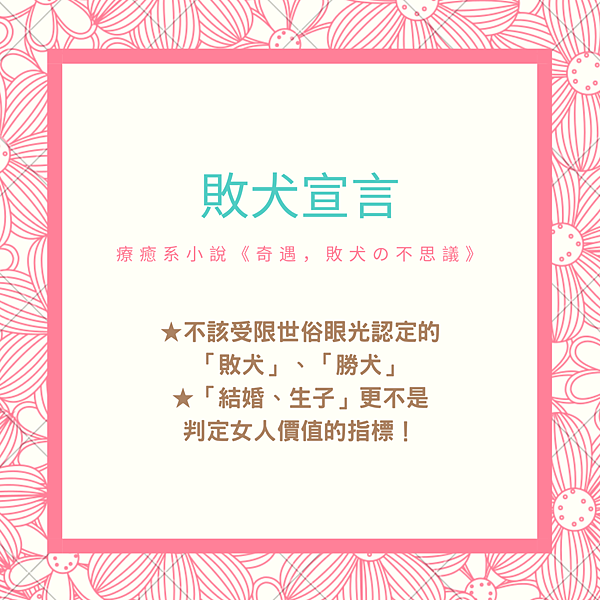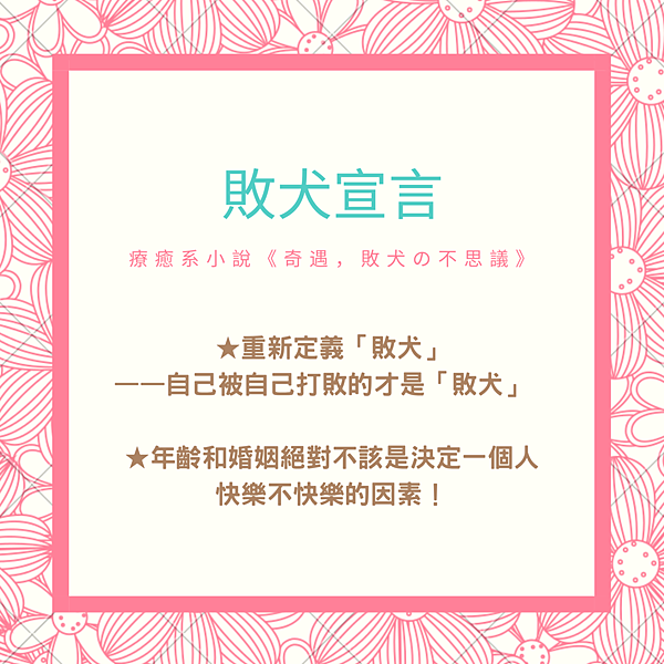 適婚年齡還單身就是敗犬?【愛情小說專賣店】姊姊妹妹站起來之敗犬宣言要顛覆世俗認定的「敗犬」定義,為什麼要分「勝」和「敗」?「結婚、生子」不是判定女人價值的指標!年齡和婚姻絕對不該是決定一個人快樂不快樂的因素!喬崴姊姊提出「優犬」這名詞,希望大家勇敢做自己,不做他人的影子。