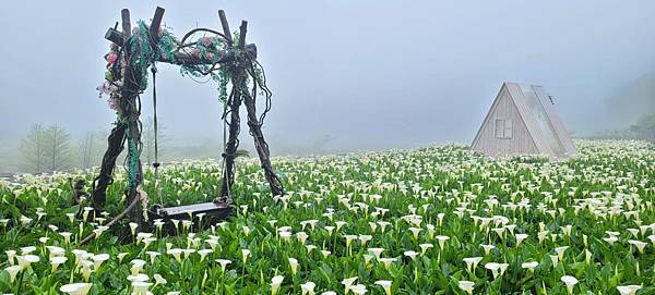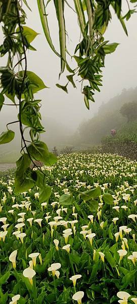 這次,好友帶我去一個有微造景的海芋田,可以當個偽網紅,那天,濃得化不開的霧加上冷冽密麻的雨,其實無法看到山環繞的整個面貌。