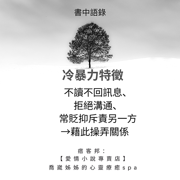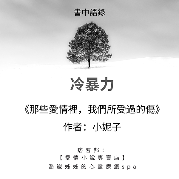 【愛情小說專賣店】 喬崴姊姊要介紹小妮子的書《那些愛情裡,我們受過的傷》,書中提到「暗藏的冷暴力:冷暴力不能解決任何問題,偏偏有些人習慣用這樣的方式操縱關係,最後可能也會用同樣的方式結束關係。這種傷害並非突發性,而是長期持續累積形成,了解冷暴力背後真相,可以盡早認清事實,將主控權拉回自己身上。」