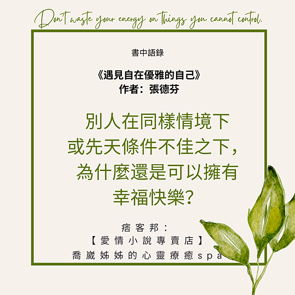 喬崴姊姊真的受夠了,我知道有些是自己心理運作模式的問題,所以,想尋求對於生命可以自在優雅的金鑰。之前也有介紹張德芬老師,相信大家都不陌生,這次想和各位分享她的《遇見自在優雅的自己》,這是更近期的書,張德芬老師透過她和粉絲讀者的互動問題,以及她觀察自己和周遭朋友的狀況,舉了不少實際例子,很多其實就是我們在生活上常發生的的困境和想法,但我們就是思考模式僵化固著甚至於大錯特錯了,因此,對境對人都用不正確的方法去應治,最後,傷最深的是自己。