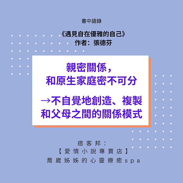 【愛情小說專賣店】張德芬老師在《遇見自在優雅的自己》書中提及,「與另一半的親密關係,和原生家庭密不可分」,喬崴姊姊驚覺是不是自己也在「病態」的既定模式下被牽引著走,小時候在家裡所有受的傷因為自己不正確的解讀和誤解,導致有毒的思維一直內化,跟隨到大,最後,在最親密的另一半面前毫無掩飾、一傾而出那從小到大長久以來的傷痛,因為,心裡面的洞和傷疤一直並未真正癒合……。