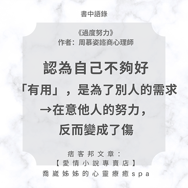 作者在書中提及:很多人會「怕自己不夠格,所以要有用」,進而追求一次次「贏」的感覺,但其實所有的成就,只是對內心焦慮暫時安撫的麻醉劑,而非是能夠化成自我肯定,甚至自我價值的禮物。