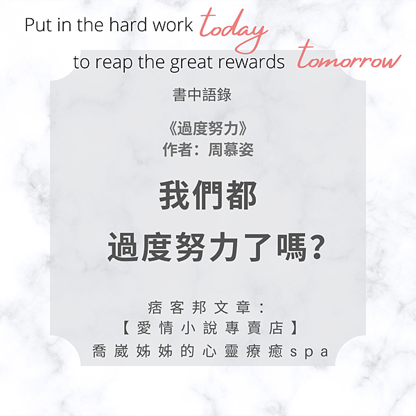 【愛情小說專賣店】喬崴姊姊這次和大家分享「過度努力」這個課題,周慕姿諮商心理師的書《過度努力》舉了好幾個個案例子,耐心引導他們說出過往的傷痛,自己家人過度控制的行為模式,剝絲抽繭每個個案為什麼會有情緒失控、退縮不想和群體接觸,甚至於產生焦慮恐慌、心悸換氣不足和憂鬱的症狀;有些人則藉由購物、暴食來面對自身心理出現的不對勁……。